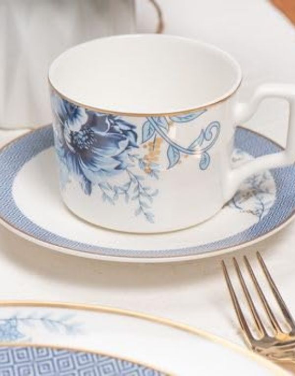 Silver Martini Ceramics A Grade Bone China Coffee & Teacup 220ml Saucer 6 inches Chinaware Set Blue Color Floral Design for Home, Banquet, Hotels & Party Pack of 1