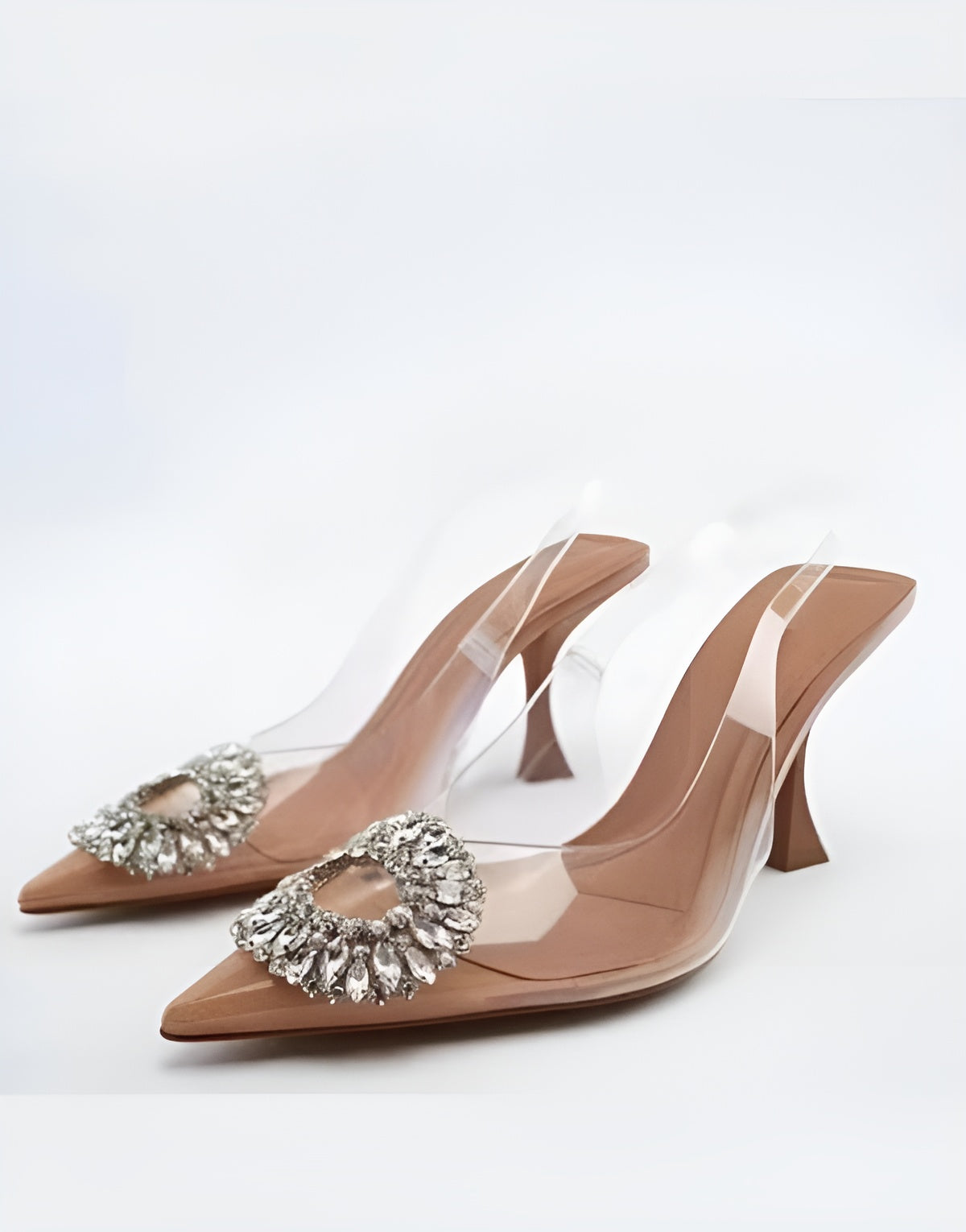 Crafted to perfection, these high heels feature a clear toe design that adds a touch of modernity to the classic silhouette. The transparent front creates an illusion of elongated legs, making you the center of attention wherever you go. The Rhinestone Buckle detail beautifully complements the clear upper, offering a dazzling sparkle that catches the light with every step.
